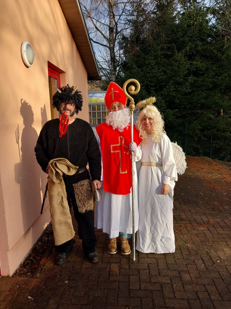 Mikuláš, čert a anděl pro česko-německé děti ze školy Johanniter-Kita Wichtelhäusel, Deutschneudorf. Je to naše dlouholetá tradice.